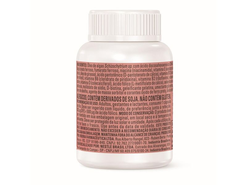 Composição:Óleo de algas Schizochytrium sp. com ácido docosahexcenoico (DHA), ascorbato de sódio (vitamina C), bisglicinato ferroso, fumarato ferroso, niacinamida (niacina), acetato de Di-alfa-tocoferol (vitamina E), óxido de zinco, óleo de girassol, D-pantotenato de cálcio (ácido pantotênico), cianocobalamina (vitamina Bi2), palmitato de retinol (vitamina A), cloridrato de piridoxina (vitamina 86), riboflavina (vitamina B2), nitrato de tiamina (vitamina BI), óxido de cobre, colecalciterol (vitamina D), l-metilfoloto de cálcio (ácido fólico), selenito de sódio, picolinato de cromo, iodeto de potássio, molibdato de sódio, D-biotina, geleificante gelatina, umectante glicerina, emulsificante lecitina, espessante cera de abelha, agente de massa sorbitol e corantes óxido de ferjo preto, óxido de ferro vermelho e dióxido de titânio.